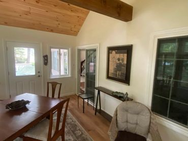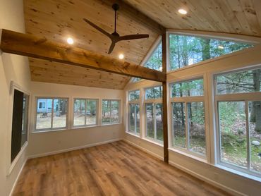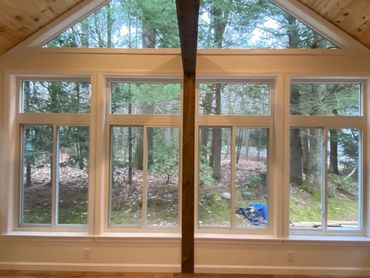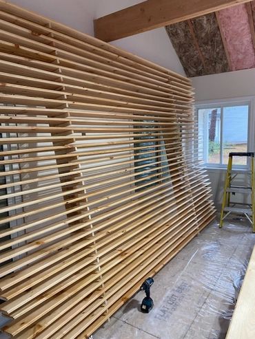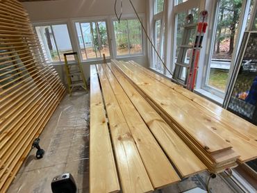 Above is our custom process for sealing and drying the tongue and groove pine boards with an oil based finish. After drying, they were installed on the cathedral ceiling prior to the triangular window trim, and the darker colored beam trim.